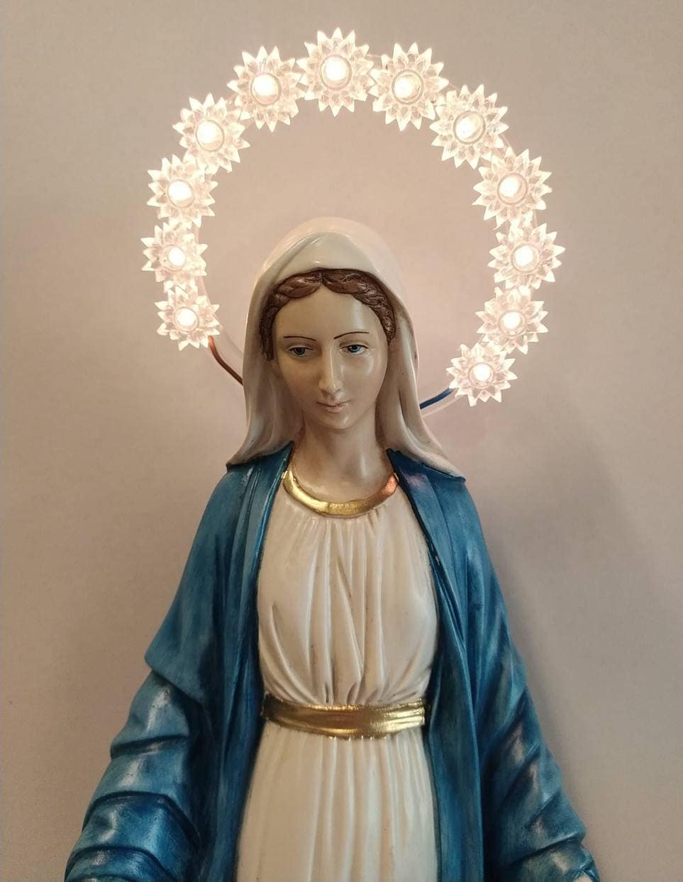 Statue of the Miraculous Madonna with bright halo diameter 14 (5.51 inches) with warm white lights, 220 volts.