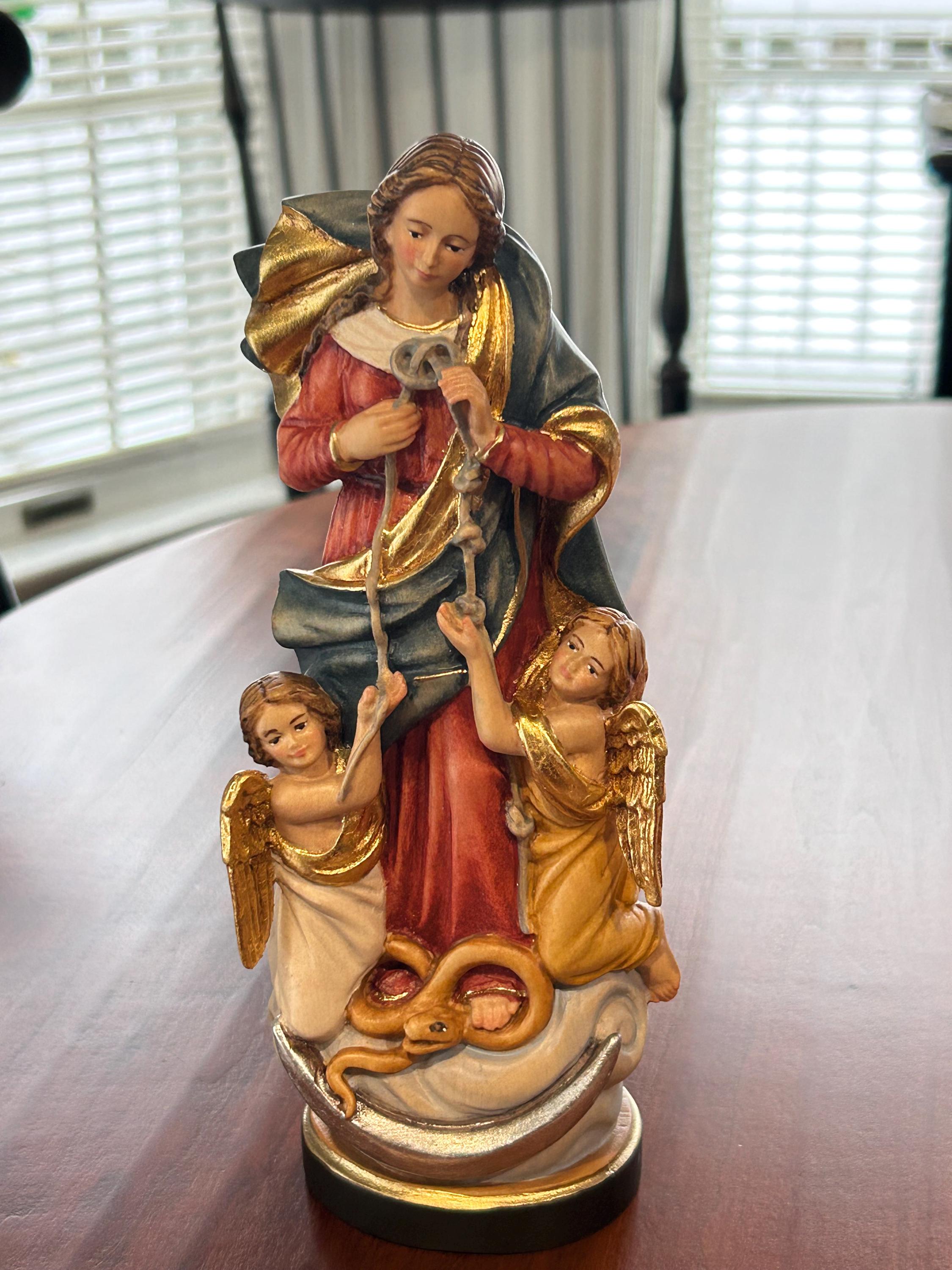 Statue of the Madonna Mary Undoer of Knots, entirely hand-carved from Val Gardena wood, finely hand-decorated and cared for in every detail.