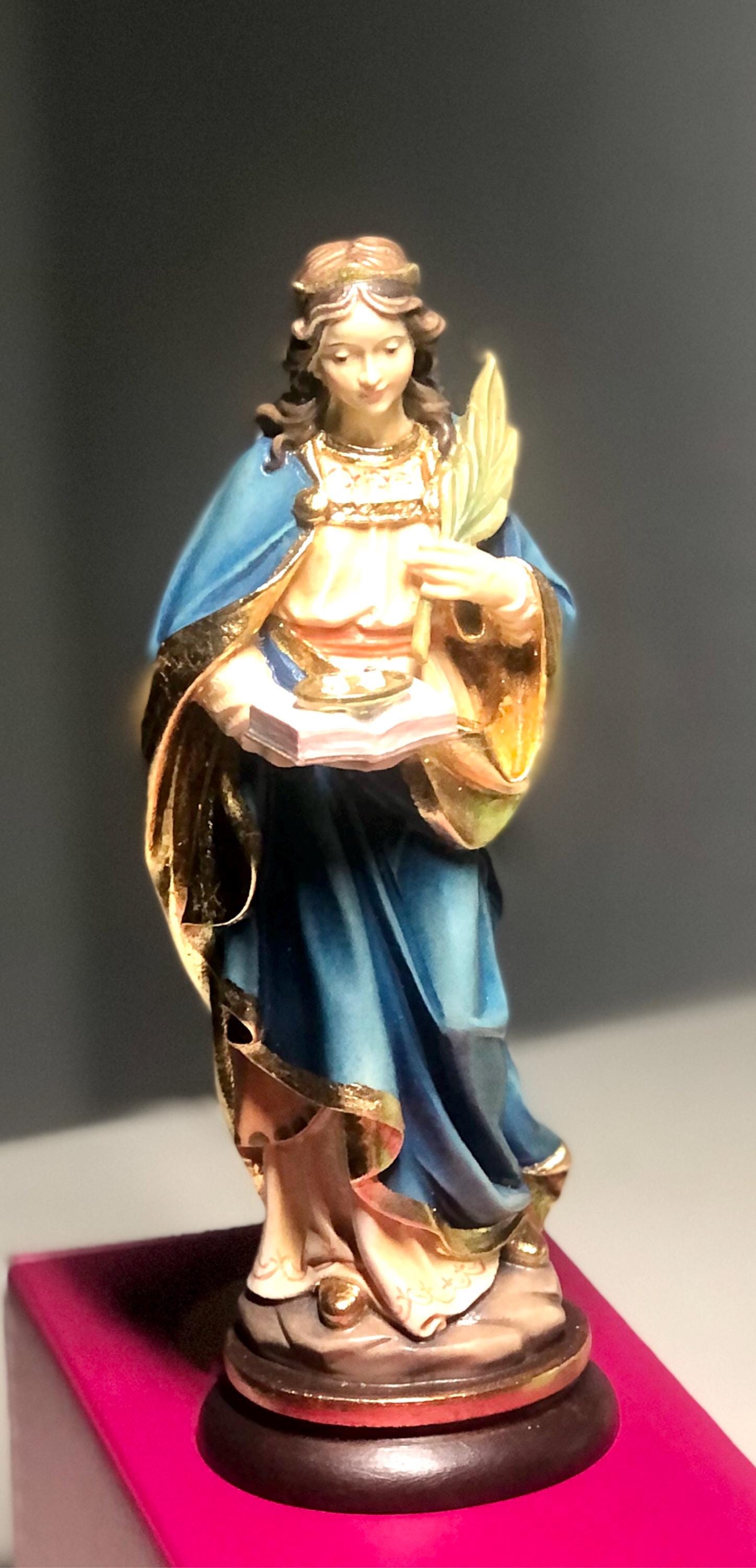 Statue of Saint Lucy of Syracuse, entirely carved from Val Gardena wood, finely hand-decorated and cared for in every detail.