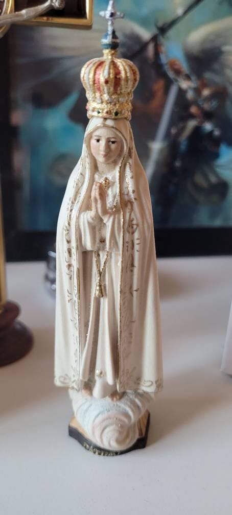 Sculpture of Our Lady of Fatima with rosary and crown, entirely hand-carved from Val Gardena wood, finely hand-decorated with oil paints and a gold leaf finish, with meticulous attention to detail. Various sizes available.